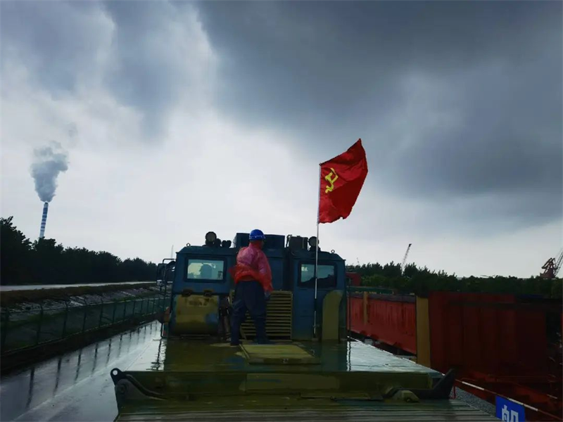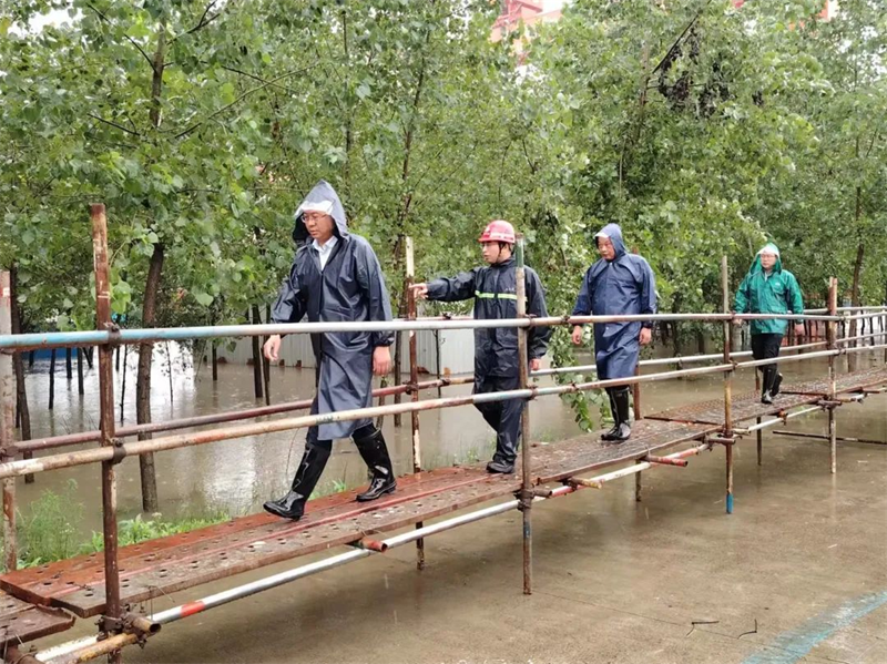 汛情就是命令,6月28日,公司迅速進入防汛警戒狀態,黨委組織召開防汛工作專題二次會議,宣布啟動三級防汛應急響應,防汛領導小組圍繞“確保財產生命安全和快速復產”,周密部署各部門防汛工作,建立6支黨員防洪突擊隊、7支青年突擊隊隨時待命,要求黨員干部靠前指揮,24小時輪崗值班,號召全體員工團結一致,共克時艱。隨著防汛領導小組一聲令下,各部門黨員、團員青年、群眾立即奔赴一線,沖鋒在前,在碼頭、閘門開展不間斷、拉網式巡邏檢查,險情排查,切實做好防汛抗洪工作。船臺區域漫水,阻斷了前往船臺上、碼頭的道路,創新的蕪船人連夜搶險,在風雨中用雙手和鐵架一寸寸搭建,搭出一條1200米長的空中“長廊”,連通碼頭、引橋和船臺;為保障汛期人員安全,“長廊”入口處設立哨口登記記錄出入情況。